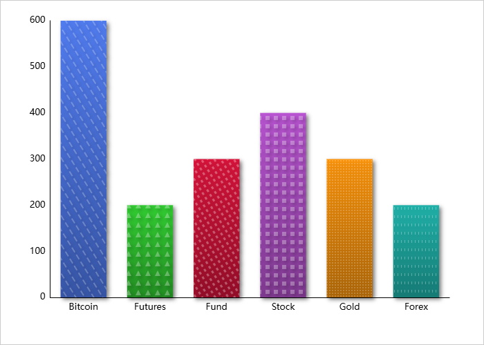 Como se muestra en el gráfico de ejemplo anterior, ahora están disponibles patrones como Diagonal, Triángulo, Puntos, Malla y más. Con la configuración predeterminada, el sistema asignará patrones automáticamente, pero puedes personalizarlos completamente yendo a la sección de Datos y seleccionando el patrón deseado en el menú desplegable Color > Patrón.
