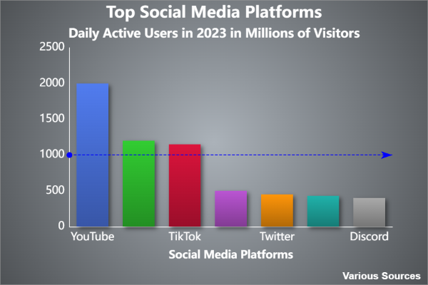 This bar chart showcases the leading social media platforms by daily active users in 2023. It shows a visual comparison or populairty between platforms like YouTube, Instagram, TikTok, Twitter and other popular platforms. With ChartGo displaying this type of visual data is simple and quick.