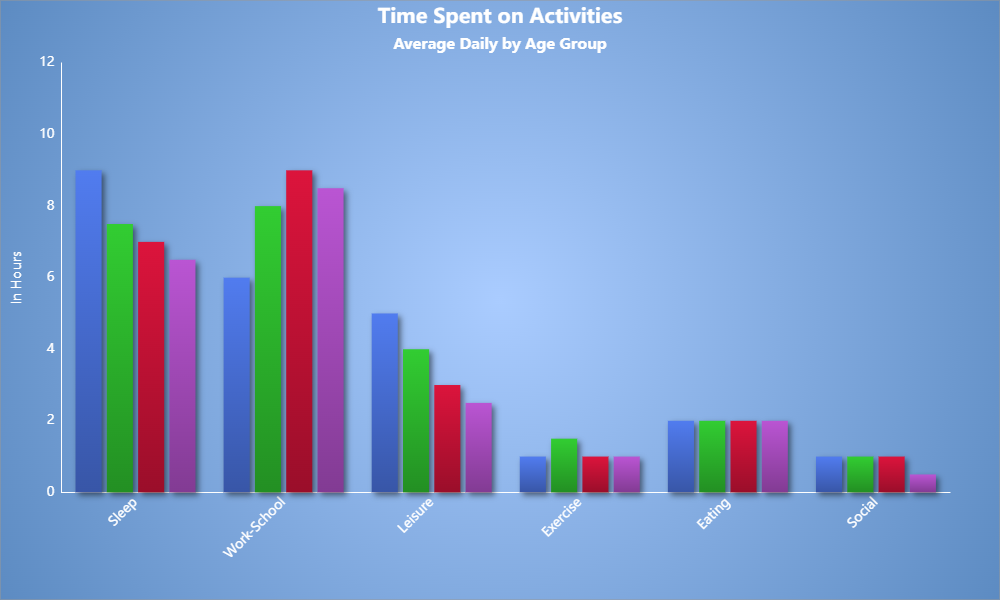 This bar chart allows you to compare multiple data groups across different categories. Useful for visualizing time allocation, demographic studies, or any data that varies across groups. Useful for presentations, reports, or to view trends within your data.