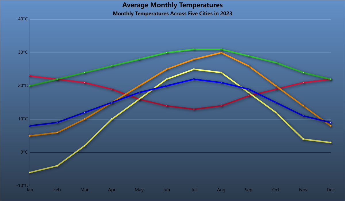 This line graph provides a clear the average monthly temperatures in four different cities. It can be used for climate analysis, travel planning, or educational purposes. It offers a visual representation into how temperatures fluctuate across different regions and seasons.