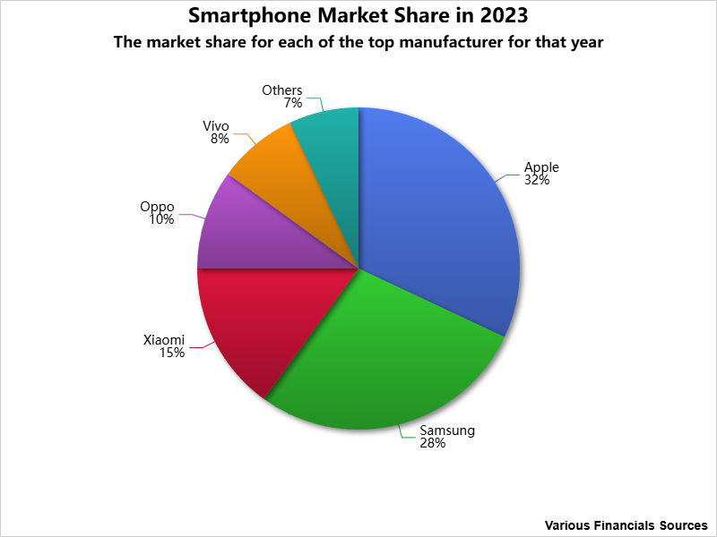 A Pie chart that displays the market share of smartphone manufacturers, like Apple and Samsung, in 2023. This type of data is often shown as pie charts and can be visually appealing due to its distribution among different categories.