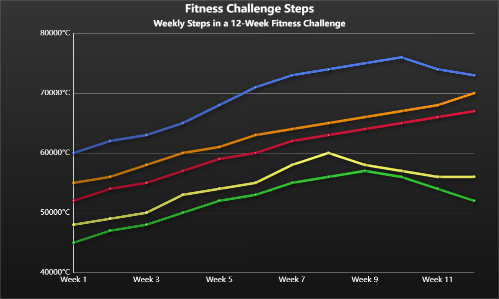 The graph highlights the amount of steps per participants. Data can be used to analyze trends in fitness engagement, motivation levels, and overall progress.