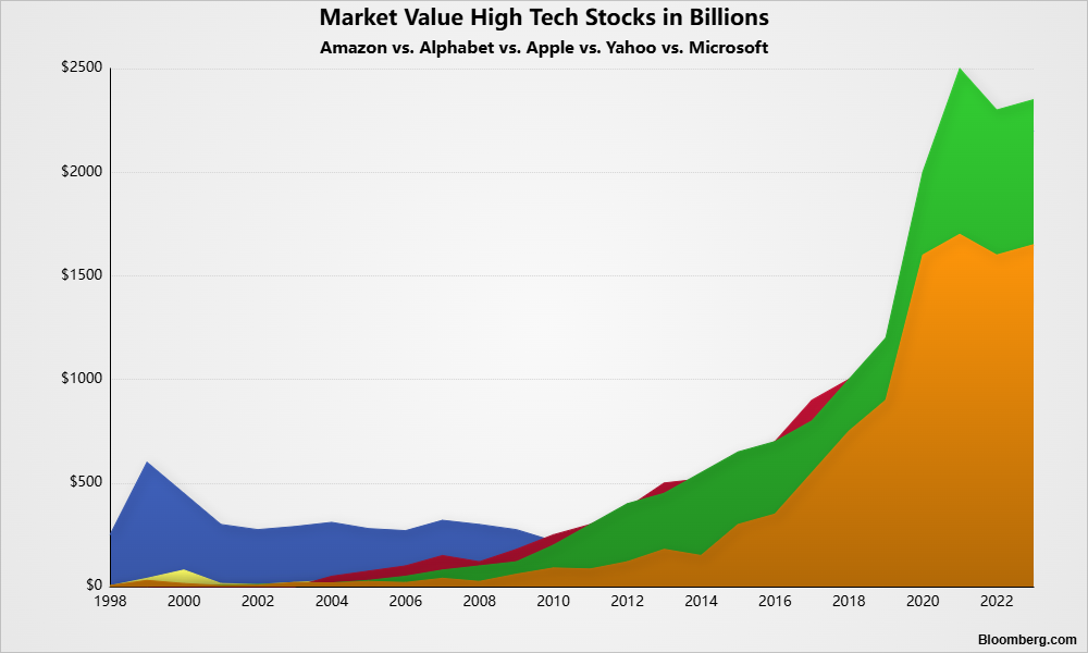 This area chart shows the market value growth of some leading tech companies from 1998 to 2023. The stacked areas represent how each company’s value has evolved over time. This graph is perfect for comparing long-term trends and shifts in market leadership among tech giants.