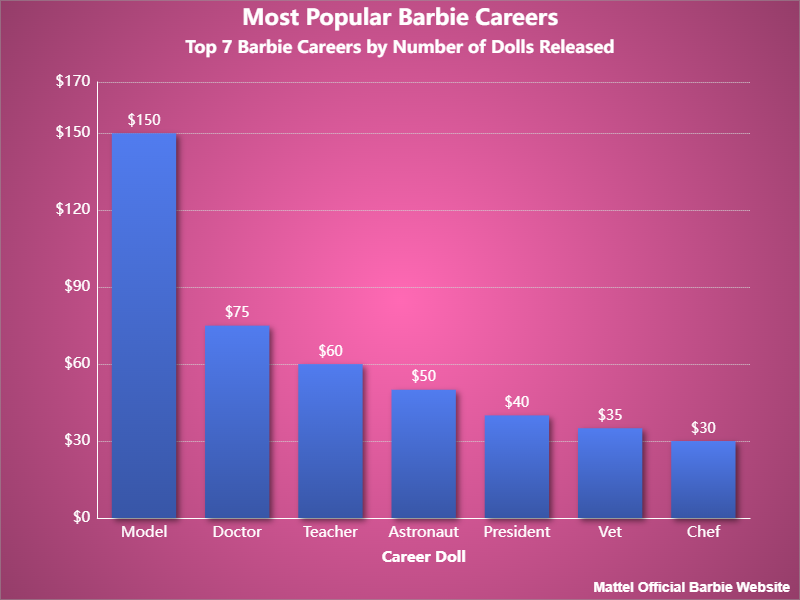 The data highlights the top Barbie careers, showing how the brand has diversified its doll offerings while keeping certain iconic professions at the forefront. The chart also makes use of labels, color gradients, and interactive tooltips, making it both informative and visually engaging.